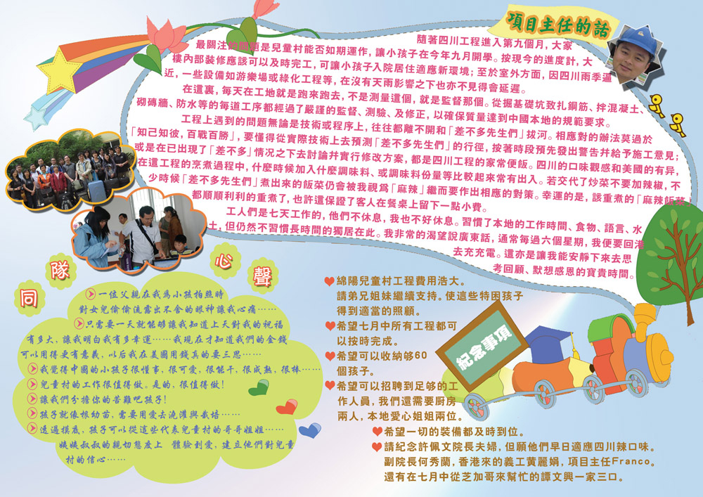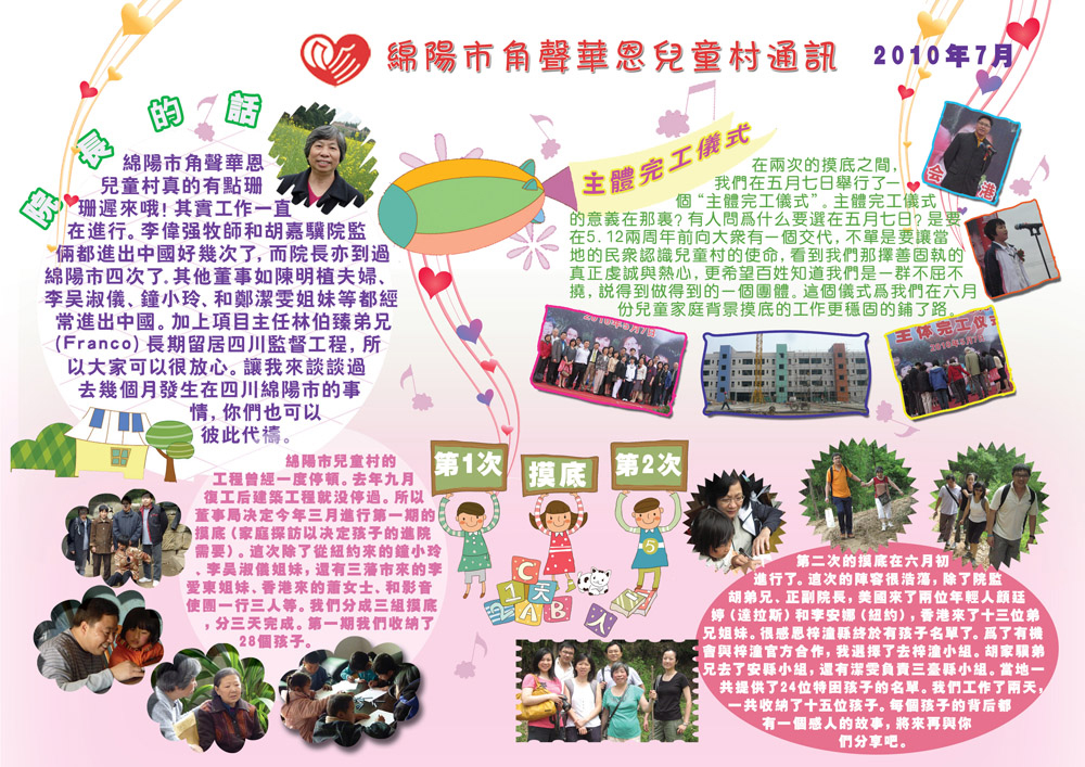 綿陽市角聲華恩兒童村真的有點珊珊來遲哦!其實工作一直在進行,李偉強牧師和胡嘉琪院監倆都進出中國好幾次了,而院長亦到過綿陽市四次了,其他董事如陳明植夫婦,李吳淑儀,鐘小玲,和鄭潔雯姐妹等都經常進出中國。加上項目主任林伯臻弟兄(Franco)長期居留四川監督工程...