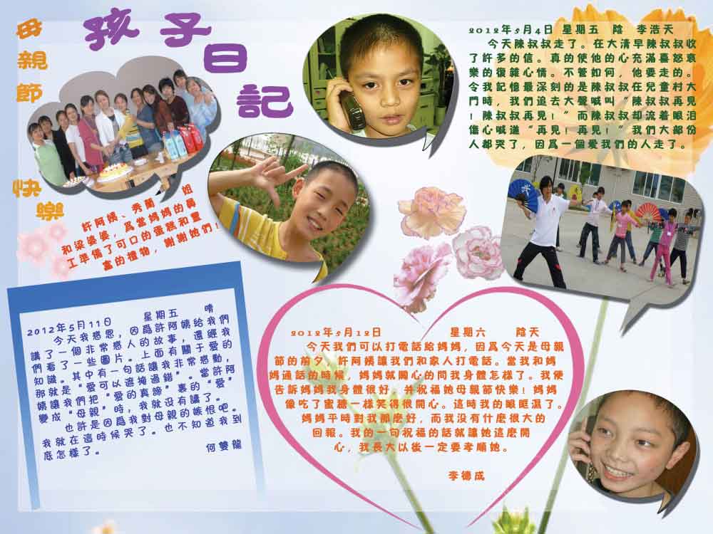 兒童村的孩子第一次紀念母親節,院長請孩子們寫一封信給自己的母親感謝她們的愛。也寫信給自己的愛心姐姐或媽媽,謝謝她們的愛心照顧,謝謝她們每天的噓寒問暖。從孩子的信中我們看到一個個天真無邪的心靈。親愛的孩子,願你們在愛中成長!得到愛,也把愛傳出去...