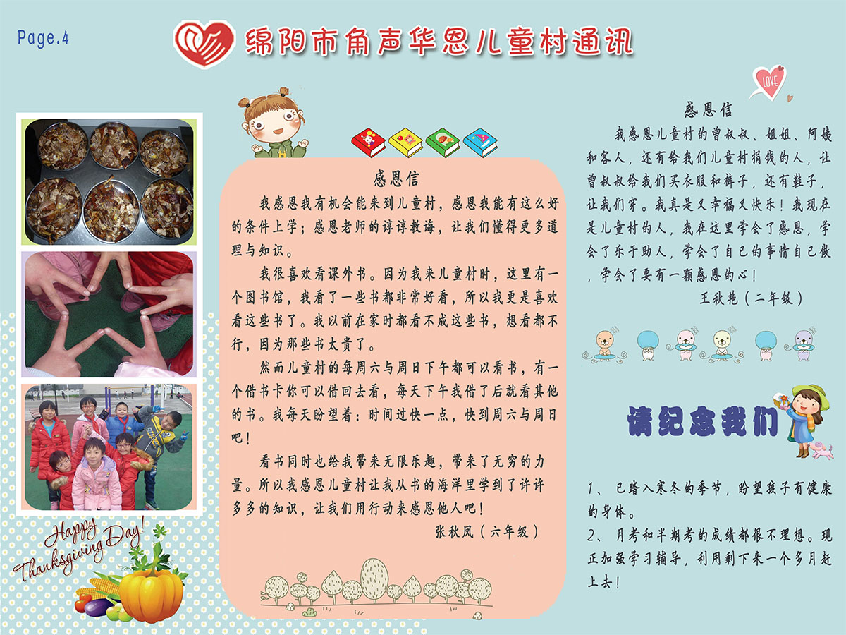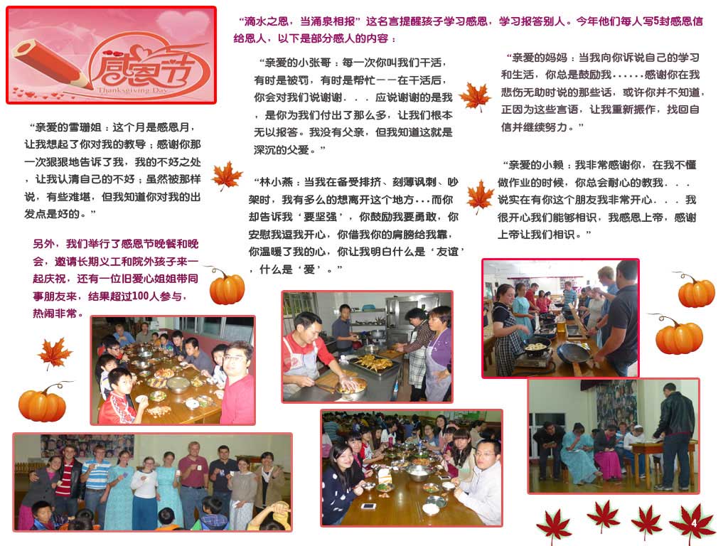 今年感恩節我們做了一件特殊的事情,我們的孩子除了寫信給家人,院裡的姐姐們和院長外,我們也鼓勵孩子寫信給為我們辛勞工作的同工,特別是負責守護天使的同工。結果同工們都很高興收到我們的信。感恩是一個很美麗的操守...